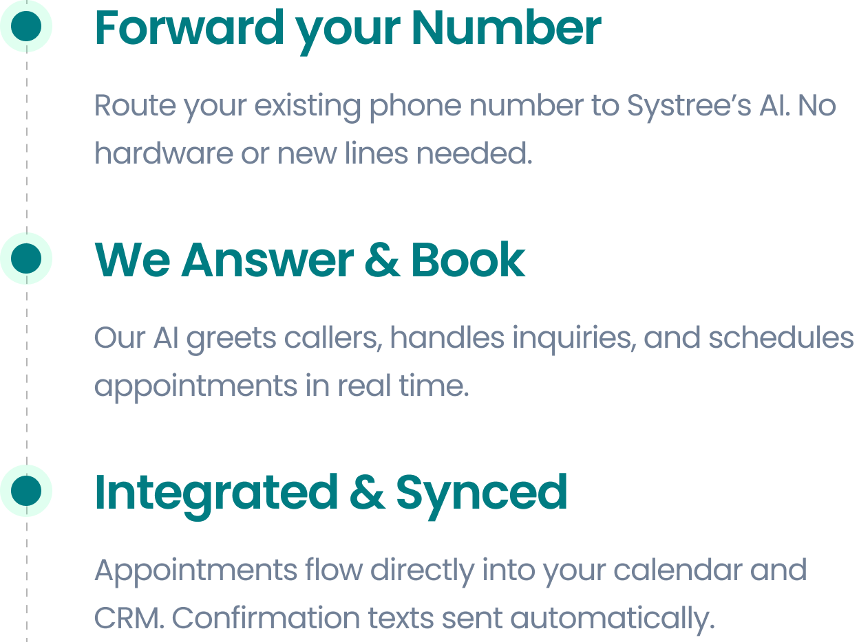Never miss a call again. Let Systree answer, schedule, and sync appointments into your CRM—automatically.